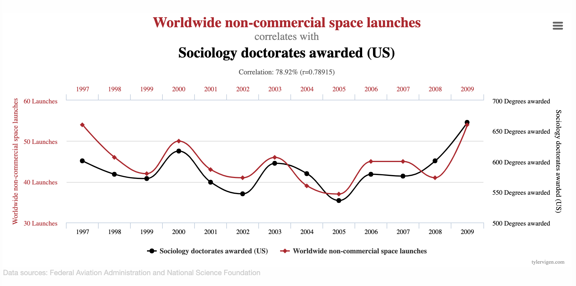 Work with your neighbor to write a misleading news article title based on this graph. (Submit on canvas as today’s check in. Access code: spurious)